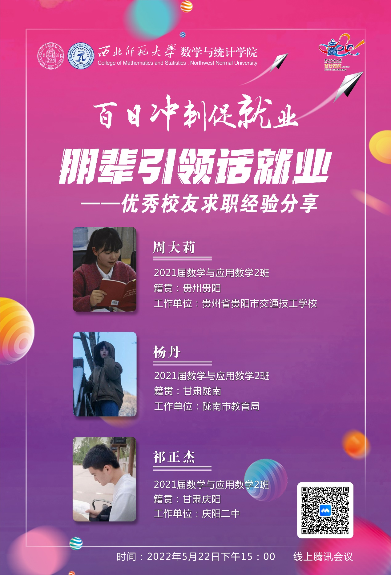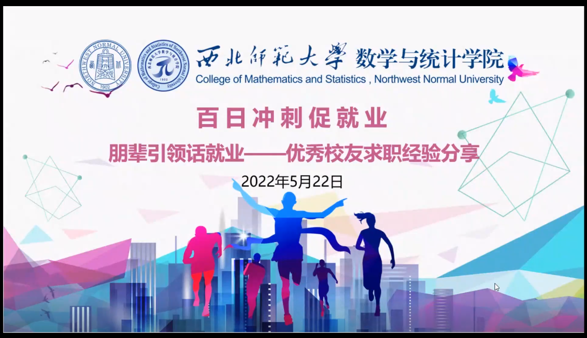 本期分享会为优秀校友求职经验分享,于5月22日下午15:00在腾讯会议进行,学院分别邀请了2021届数学与应用数学2班周大莉、杨丹、祁正杰三位优秀校友为学弟学妹们分享求职的心得与经验。