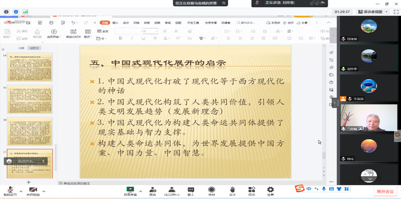会上,马克思主义学院马俊峰教授从中国共产党第二十次全国代表大会主题的提出、如何理解西方现代性问题、中国式现代化特征、阐释中国式现代化的方法论、中国式现代化展开的启示等五个方面,对二十大报告做了深入细致的分析解读。