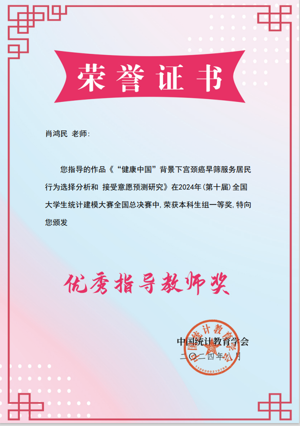 此赛事吸引了来自全国各地的众多高校参赛,竞争异常激烈。荣获本科组全国一等奖团队通过深入的数据分析和精确的模型构建,开展了《“健康中国”背景下宫颈癌早筛服务居民行为选择分析和接受意愿预测研究》,展示了团队在统计建模领域的卓越能力和团队合作精神,评委们对他们的作品给予了高度评价,不仅为学校争得了荣誉,也为团队成员的学术生涯增添了浓墨重彩的一笔。9728太阳集团肖鸿民教授同时获得了“优秀指导教师“的殊荣。