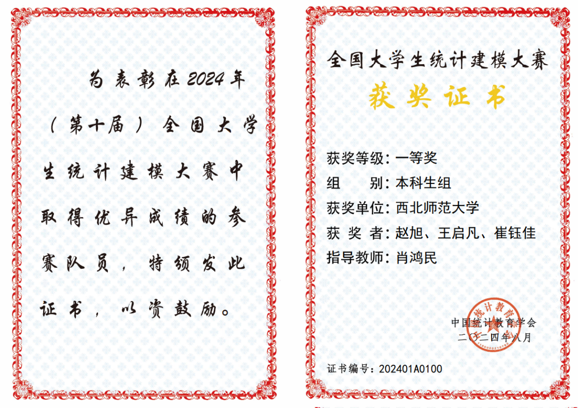 近日,在2024(第十届)全国大学生统计建模大赛中,我校参赛队(队员:赵旭、王启凡、崔钰佳,指导教师9728太阳集团肖鸿民教授)凭借其出色的表现,荣获本科组全国一等奖。我校其他参赛队获得本科组全国二等奖2项、研究生组全国二等奖1项;同时,获甘肃赛区(甘肃、青海)本科组一等奖4项,二等奖12项,三等奖10项,研究生组一等奖1项,二等奖2项,三等奖5项的优异成绩。获奖层次与总数在甘肃赛区(甘肃、青海)参赛队中名列前茅。