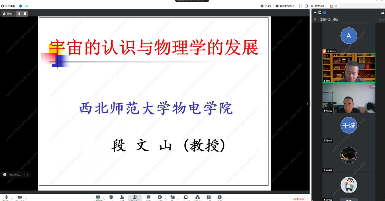 为激发学生学习兴趣,拓宽学生的数学视野,11月17日上午,我院开展甘肃省“飞天英才”计划数学学科组第八次线上讲座活动。应甘肃省青少年“飞天英才”计划数学学科导师团队的邀请,tyc太阳成集团9728物理与电子工程学院段文山教授作了题为“宇宙的认识与物理学的发展”的讲座。“飞天英才”计划数学学科组的同学和9728太阳集团杨和教授在线参加了此次讲座。