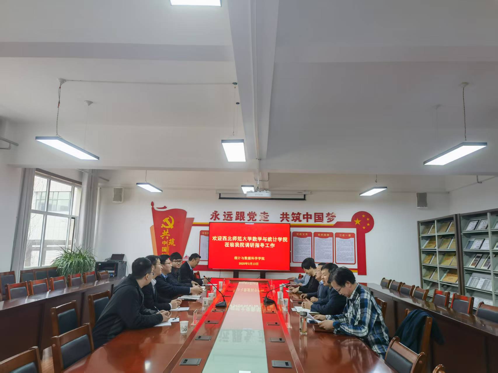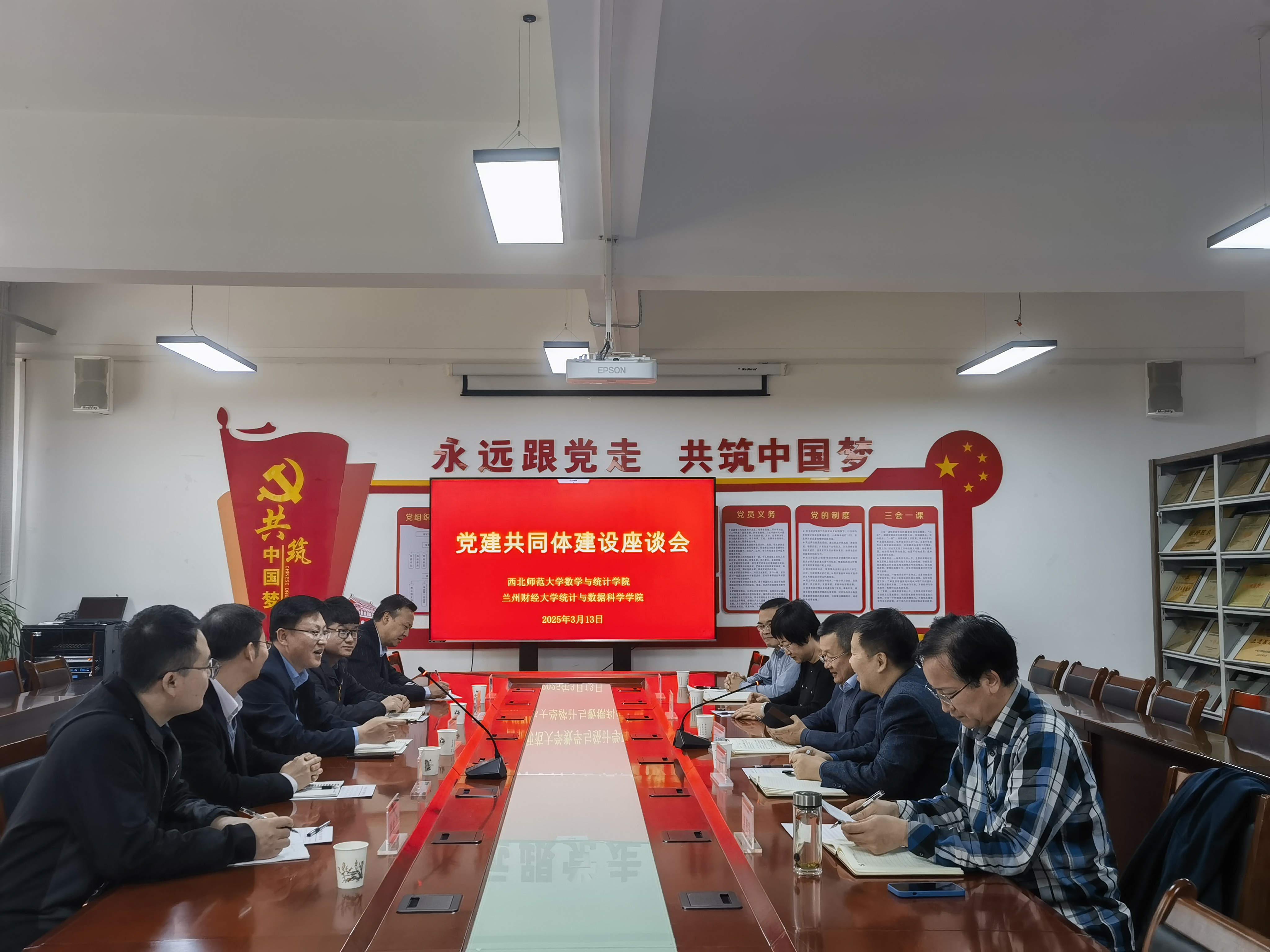 为深入学习贯彻习近平新时代中国特色社会主义思想,深化新时代基层党组织建设,进一步推动党建与事业发展深度融合,3月13日下午,学院党委书记孙小春、副书记张向东、副院长乔军胜、信计与统计系系主任杨宏、青年教师代表唐世平赴兰州财经大学开展“党建共同体”调研交流。兰州财经大学统计与数据科学学院党委书记刘广场,院长、副书记刘明,党委副书记、副院长关国霞,副院长郭精军、副院长胡炜童等参加了座谈会。座谈会由刘广场主持。