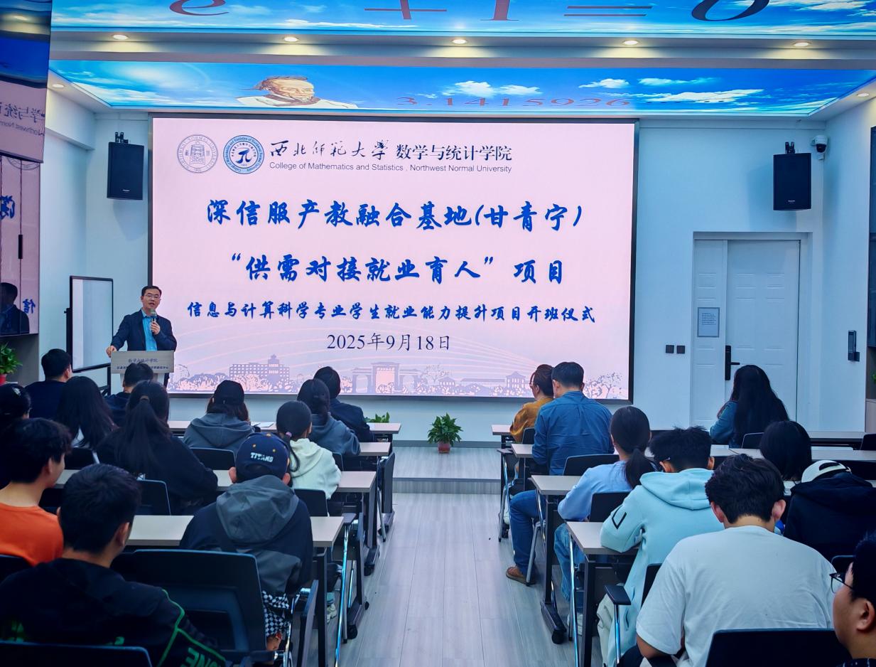 9月18日晚,学院与深信服产教融合基地(甘青宁)合作开展的“教育部供需对接就业育人”项目——信息与计算科学专业学生就业能力提升项目开班仪式在致勤楼D07报告厅举行。深信服西北大区产教融合业务总经理冯金凤、深信服产教融合基地产品经理刘思汝,学院副院长张国宝、党委副书记张向东、信计与统计系主任杨宏、专职辅导员包佳佳以及信息与计算科学专业学生参加。